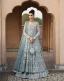 Description:ÂCapturing the true essence of heritage crafts, Dorien mesmerizes. Cut from mint blue net, the pishwas dazzles with sequins, stones and resham adornments. Paired with an embellished tissue lehnga and embellished net dupatta, this piece will ensure you shine at your special events.