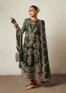 The formal outfit is made of embroidered and embellished organza long shirt, giving it a luxurious and intricate look. The trousers are maroon korean raw silk, giving a traditional look. And dupatta is adorned with diagonal embroidered lines  with four side scalloped borders, featuring beautiful designs, and it’s complemented by the four side embroidered borders. This outfit is a perfect blend of traditional and contemporary elements.